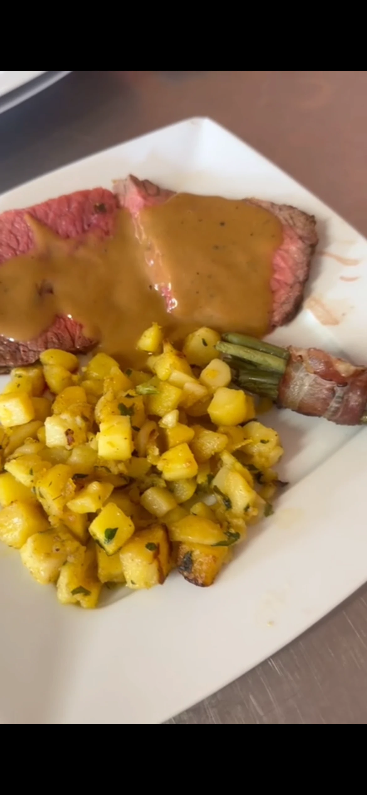 Rosbif pomme de terre fagots d’haricot Kouign Amann glace vanille